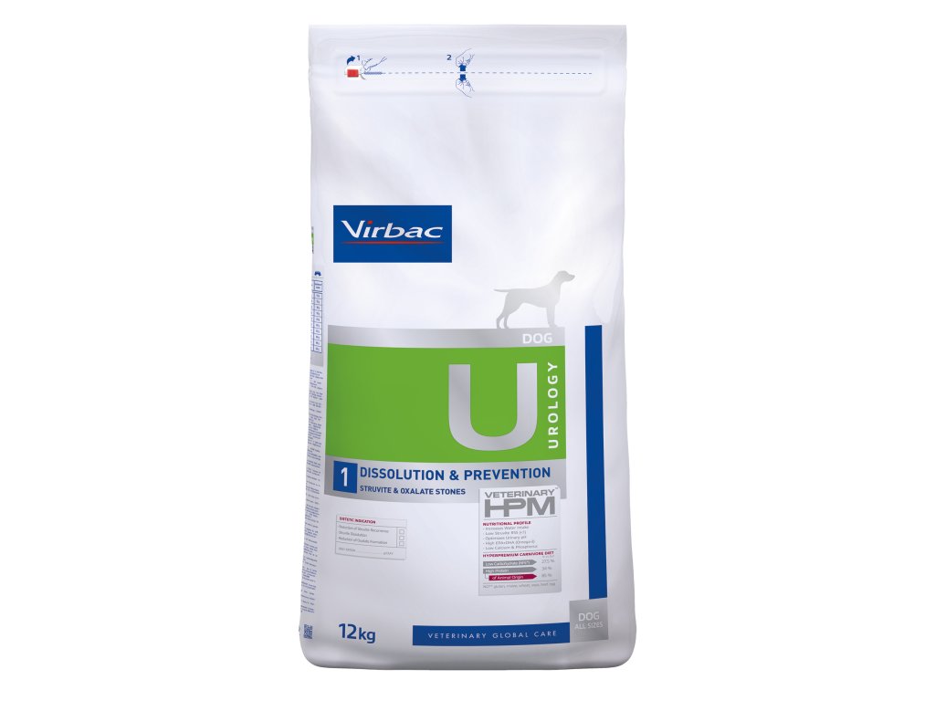 Dietní suché krmivo Virbac se vyznačuje vlastnostmi alkalizujícími moč. Spolu s nízkou hladinou vápníku a vitaminu D může pomoci snížit tvorbu oxalátových kamenů. Virbac Veterinary HPM Dog Urology Dissolution & Prevention U1 má také nízký obsah hořčíku, který snižuje tvorbu nových struvitových kamenů a podporuje jejich rozpouštění.