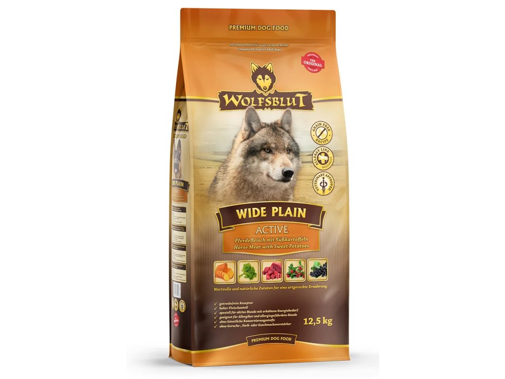 Vlci loví svou kořist od Skalistých hor Severní Ameriky, arktické tundry, hor a lesů Evropy až po pouště a stepi střední Asie. To jim dodává maso a vnitřnosti bohaté na živiny, ale také zeleninu, ovoce, bobule, kořeny a bylinky z obsahu žaludku kořisti. Obilí zde není zahrnuto. Vlk tak přijímá potřebné vitamíny, minerály, stopové prvky, enzymy a druhotné rostlinné látky. Vzhledem k tomu, že vlk je předkem všech psů, naše suché krmivo pro psy Wolfsblut je založeno na přirozených stravovacích návycích vlka. Obsahuje hodně masa nebo ryb v kombinaci se superpotravinami, které obsahují hodnotné ingredience – stejně jako v přírodě, bez obilovin. Náš výběr výjimečných druhů masa a superpotravin bohatých na živiny vychází z vlčích biotopů a jejich pestré stravy. Wolfsblut nabízí každému psovi druhově vhodnou a originální stravu a díky rozmanitosti odrůd si každý najde něco, co snese. Receptura suchého krmiva WIDE PLAIN ACTIVE kombinuje výživu vlků s nejnovějšími vědeckými poznatky o správné výživě psů.