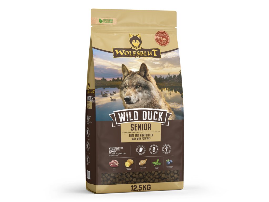 Vlci loví svou kořist od Skalistých hor Severní Ameriky, arktické tundry, hor a lesů Evropy až po pouště a stepi Střední Asie. Ty jim z obsahu žaludku kořisti poskytují maso a na živiny bohaté vnitřnosti, stejně jako zeleninu, ovoce, bobule, kořeny a bylinky. Obiloviny nejsou zahrnuty. Takto vlk získává vitamíny, minerály, stopové prvky, enzymy a druhotné rostlinné látky, které potřebuje. Protože vlk je předkem všech psů, je naše suché krmivo pro psy Wolfsblut založeno na přirozených stravovacích návycích vlka. Obsahuje dostatek masa nebo ryb v kombinaci se superpotravinami s cennými ingrediencemi – stejně jako v přírodě, bez obilovin. Náš výběr výjimečného masa a superpotravin bohatých na živiny je založen na vlčím prostředí a jeho rozmanité stravě. WOLFSBLUT nabízí každému psovi druhově vhodnou a přirozenou stravu a díky své rozmanitosti si každý pes najde to své. Receptura suchého krmiva WILD DUCK SENIOR kombinuje stravu vlka s nejnovějšími vědeckými poznatky o správné výživě psů.