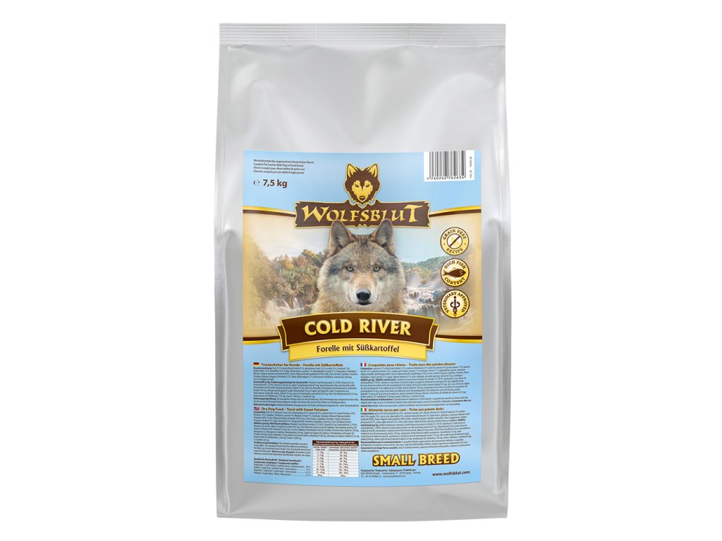 Vlci loví svou kořist od Skalistých hor Severní Ameriky, arktické tundry, hor, lesů a řek Evropy až po pouště a stepi střední Asie. To jim dodává maso a ryby a vnitřnosti bohaté na živiny, ale také zeleninu, ovoce, bobule, kořeny a bylinky prostřednictvím obsahu žaludku kořisti. Obilí zde není zahrnuto. Vlk tak přijímá potřebné vitamíny, minerály, stopové prvky, enzymy a druhotné rostlinné látky. Vzhledem k tomu, že vlk je předkem všech psů, naše suché krmivo pro psy Wolfsblut je založeno na přirozených stravovacích návycích vlka. Obsahuje hodně masa nebo ryb v kombinaci se superpotravinami, které obsahují hodnotné ingredience – stejně jako v přírodě, bez obilovin. Náš výběr výjimečných druhů masa a superpotravin bohatých na živiny vychází z vlčích biotopů a jejich pestré stravy. Wolfsblut nabízí každému psovi druhově vhodnou a originální stravu a díky rozmanitosti odrůd si každý najde něco, co snese. Receptura suchého krmiva COLD RIVER SMALL BREED kombinuje výživu vlků s nejnovějšími vědeckými poznatky o správné výživě psů.