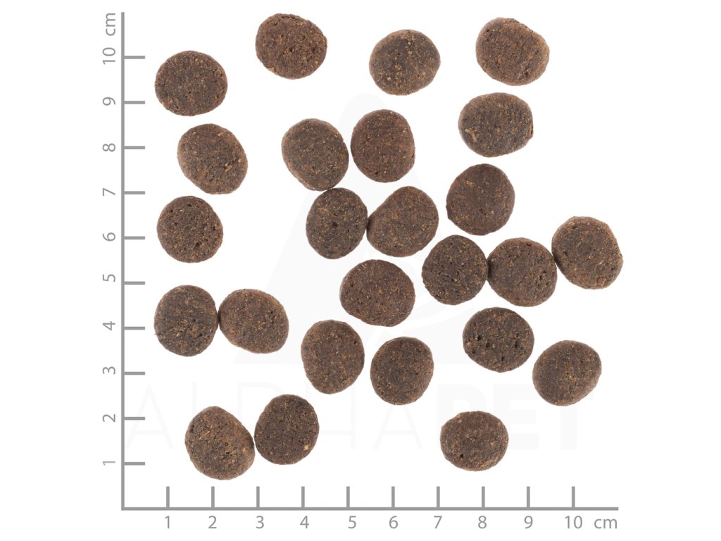 Hrubý protein 20%, hrubý tuk 12%, hrubý popel 8,5%, hrubá vláknina 3%, škrob 37%, omega-6 mastné kyseliny 2%, omega-3 mastné kyseliny 0,8%, kyselina linolová 1,4%, DHA/EPA 0,31 %, vápník 1,2 %, fosfor 0,75 %, draslík 0,6 %, sodík 0,3 %.