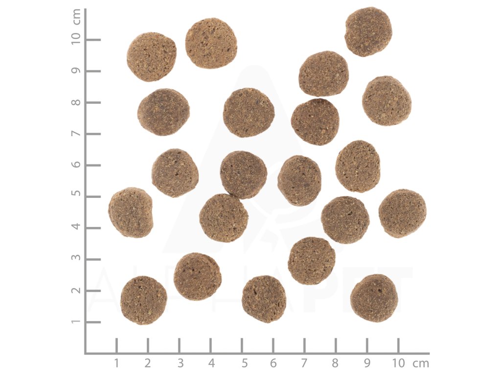 Hrubý protein 22 %, hrubý tuk 8 %, hrubý popel 8 %, hrubá vláknina 7 %, celkový cukr 4,4 %, škrob 30 %, omega-6 mastné kyseliny 1,8 %, omega-3 mastné kyseliny 0,3 %, kyselina linolová 1,8 %, DHA/EPA 0,16 %, vápník 1,3 %, fosfor 1 %, draslík 0,9 %, sodík 0,3 %.