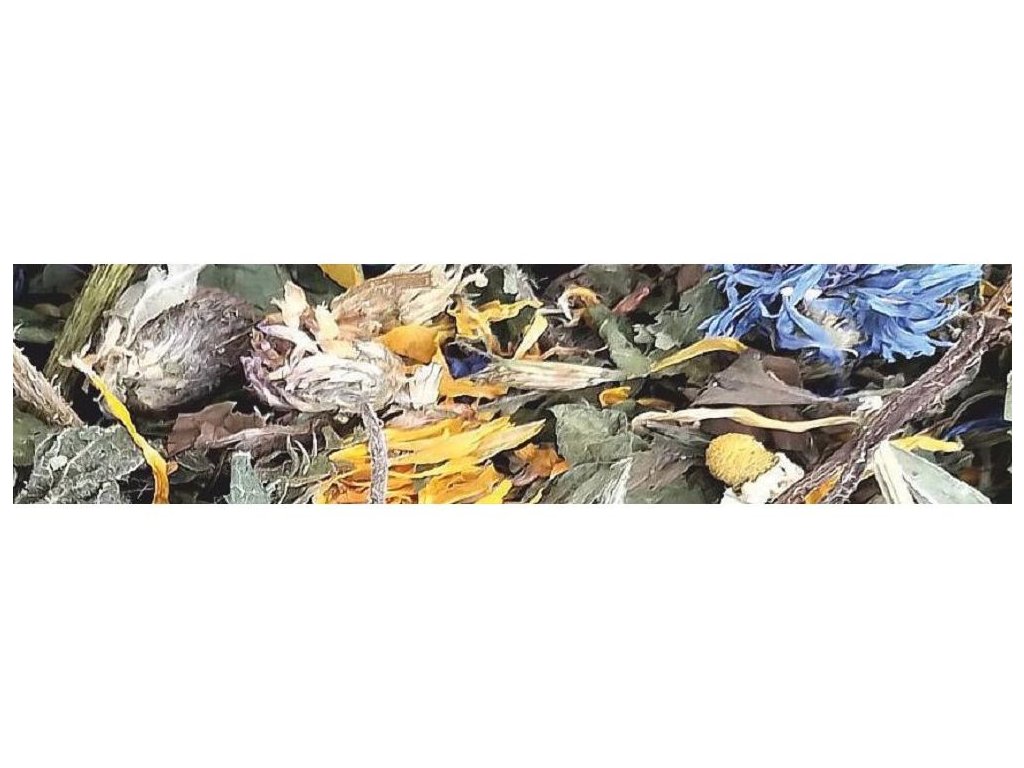 Složení: heřmánkový květ sušený, chrpa modrá sušená, okvětní lístky růží sušené, květy červené jetele sušené, listy kopřivy sušené, květ měsíčku sušený, echinacea sušená, listy pampelišky sušené