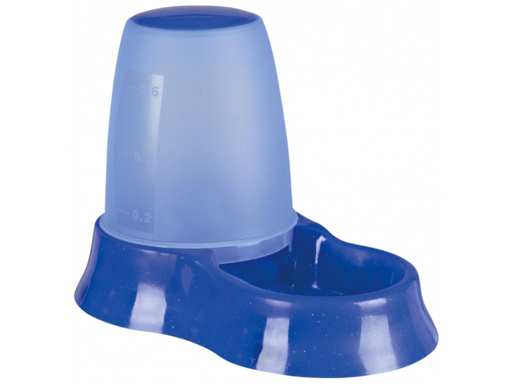 Průhledný zásobník umožňuje kontrolu množství krmení či vody v zásobníku. Má dva různé otvory pro vodu nebo pro krmivo. Zásobník má gumové protiskluzové nožičky, které zamezují posunování zásobníku při žraní. Možné využití pro psy nebo kočky na cestách.Barva: různá
