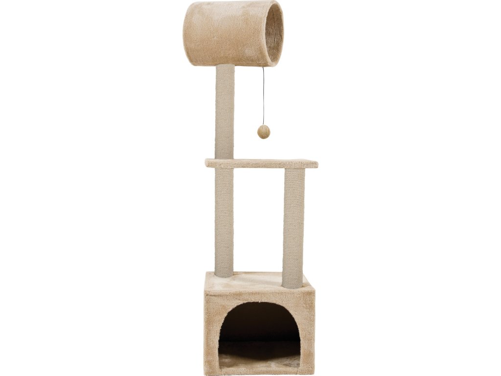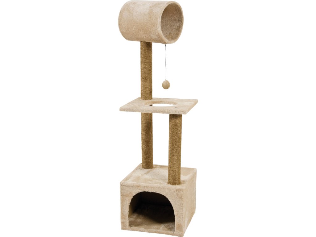 Škrabadlo pro kočky s domečkem, škrabacími sloupky, odpočívadly a hračkou.