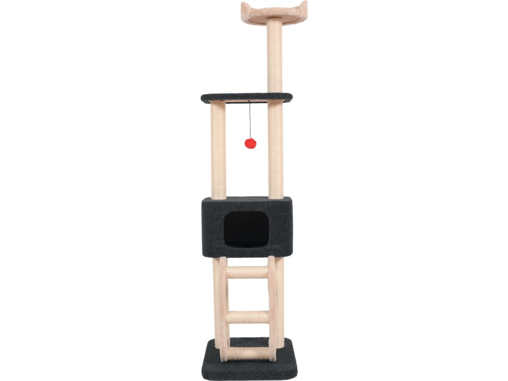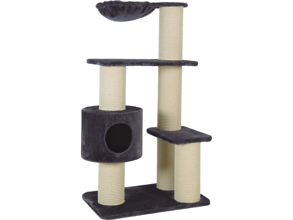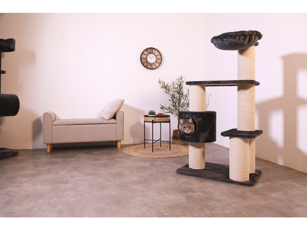 4 v 1: škrabadlo, odpočinkové místo a 2 plošiny kombinuje polstrovanou boudu z umělé kožešiny, dvě plošiny z umělé kožešiny, závěsnou houpací síť vyrobenou z umělé kožešiny a šest škrabadel ze sisalové rohože.