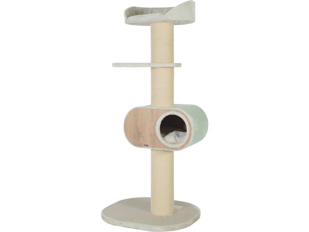 Nádherný kočičí strom/škrabadlo s čistými liniemi v art deco stylu dokonale splyne s interiérem vašeho domova. Díky kvalitním materiálům jsou všechny části robustní a pohodlné: melamínová jeskyně, sloupek pokrytý sisalovou rohoží, kožešinovou plošinou a polštář. Struktura tohoto kočičího stromu je vyrobena ze 100% FSC® - certifikovaného dřeva a sloupek je pokryt dlouhotrvající sisalovou rohoží. Jeskynní polštář je praktický a lze ho pro snadnou údržbu vyjmout. Jeskyně má jen 1 otvor, díky kterému se kočky cítí BEZPEČNĚ. Škrabadlo má vysokou stabilitu a je pro kočky velmi pohodlné.